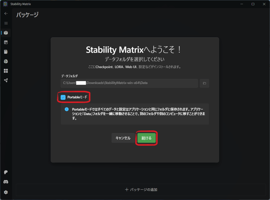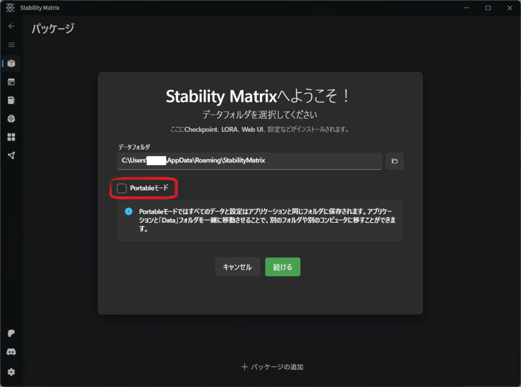 「Portableモード」にチェックを入れていることを必ず確認して「続ける」ばクリックしたらUSBメモリにStability Matrixのインストールが始まるけんね!