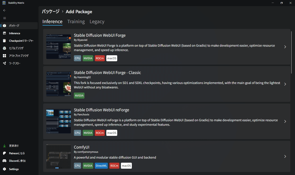 無事にインストールが完了すると、自分が作業したいWebUIを選んで導入することができるようになるよ。Stable Diffusionとか、ComfyUIとか、いろんなパッケージがワンクリックで導入できるようになっとるけん、ワクワクが止まらんたい!
