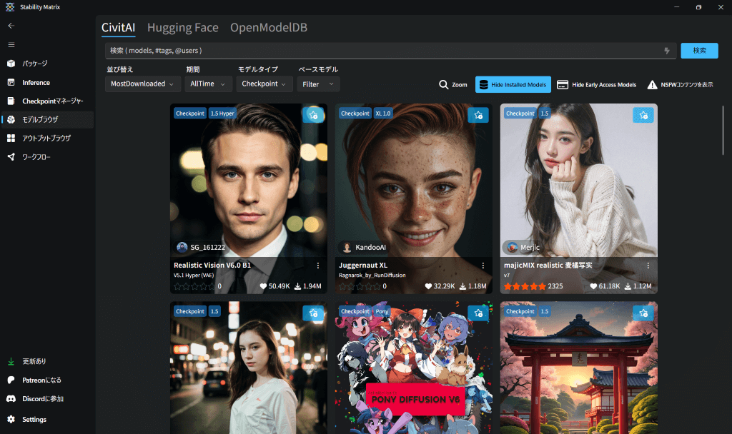 Stability Matrix内の「モデルブラウザ」ば開いたら、モデルのダウンロードもここからできるようになっとるよ。モデルはAIの“絵を描くための頭脳”みたいなもので、いろんな種類(写実、アニメなど)が存在するっちゃん。